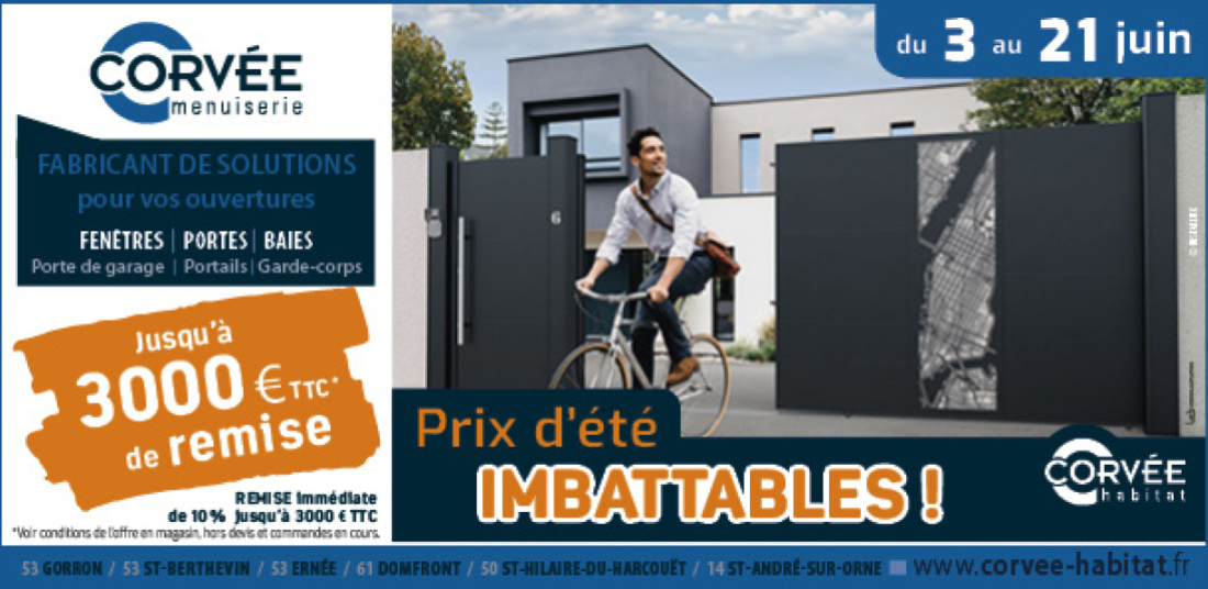 Du 3 juin au 21 juin, c’est les jours à prix imbattables chez MENUISERIE CORVEE ! Profitez de l’occasion pour obtenir une remise exceptionnelle allant jusqu'à 3 000€ pour tout achat de fourniture avant le 21 juin.